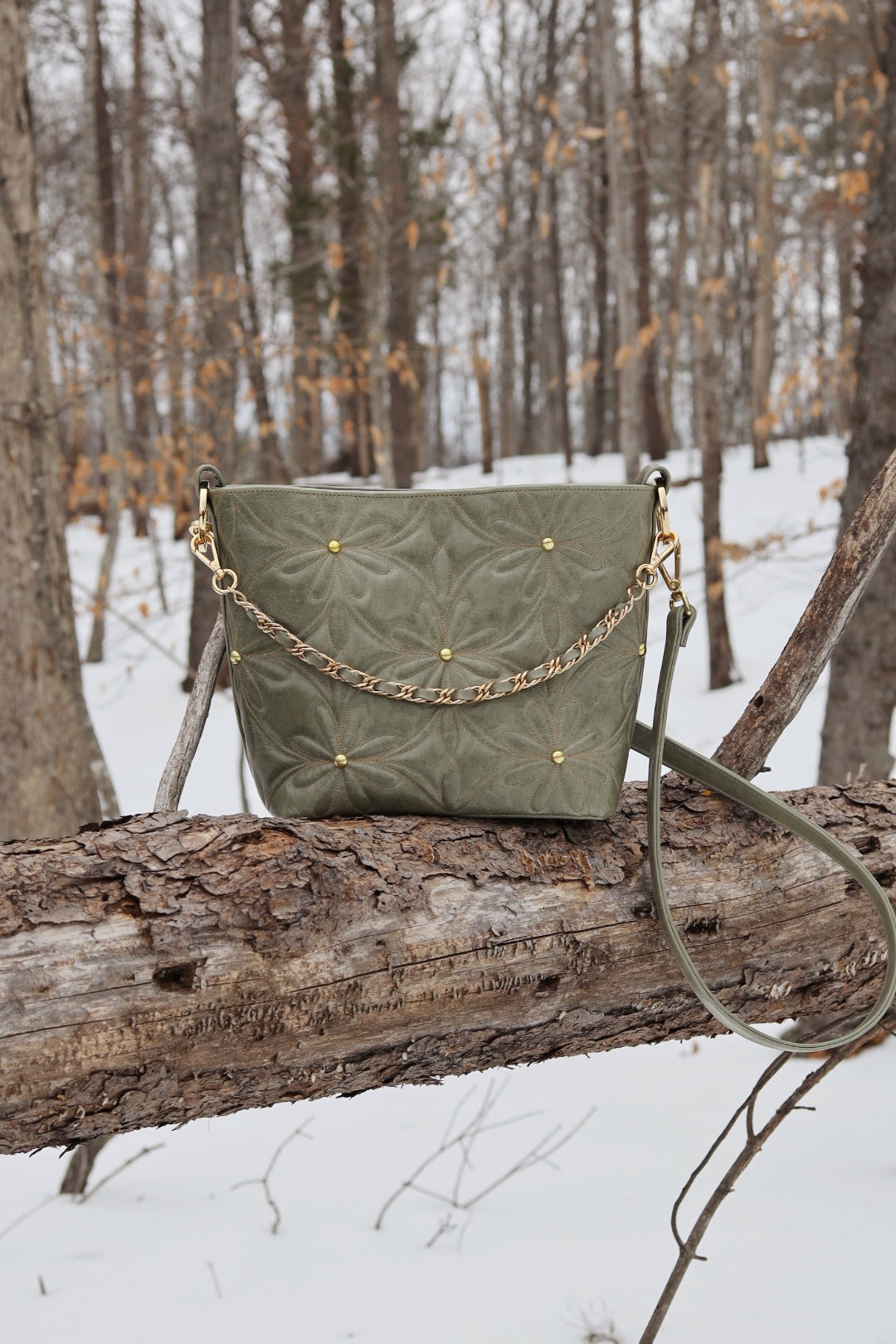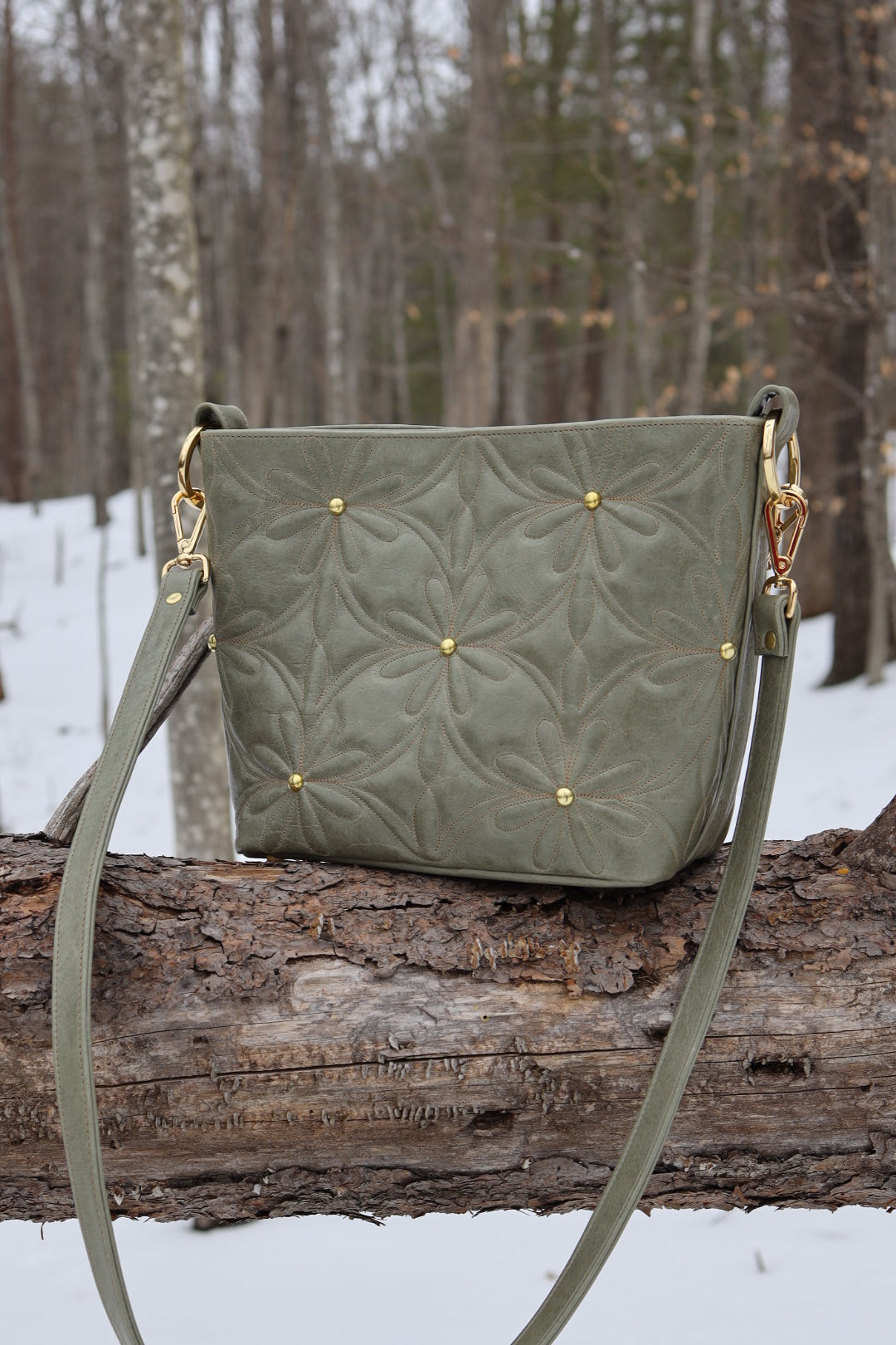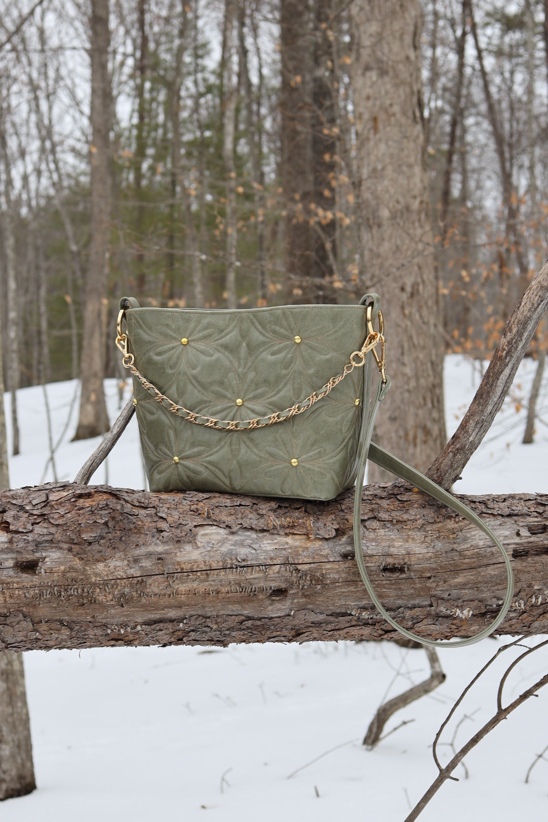 This elegant handbag is made from a sage green Italian cowhide and features an original quilted Daisy design done one stitch at a time on a near 100 year old sewing machine. The interior is lined in a metallic gold leather with a zipper pocket, slip pocket and magnetic closure. It has a short detachable chain strap as well as a longer leather strap so it can be used as a shoulder or crossbody bag.